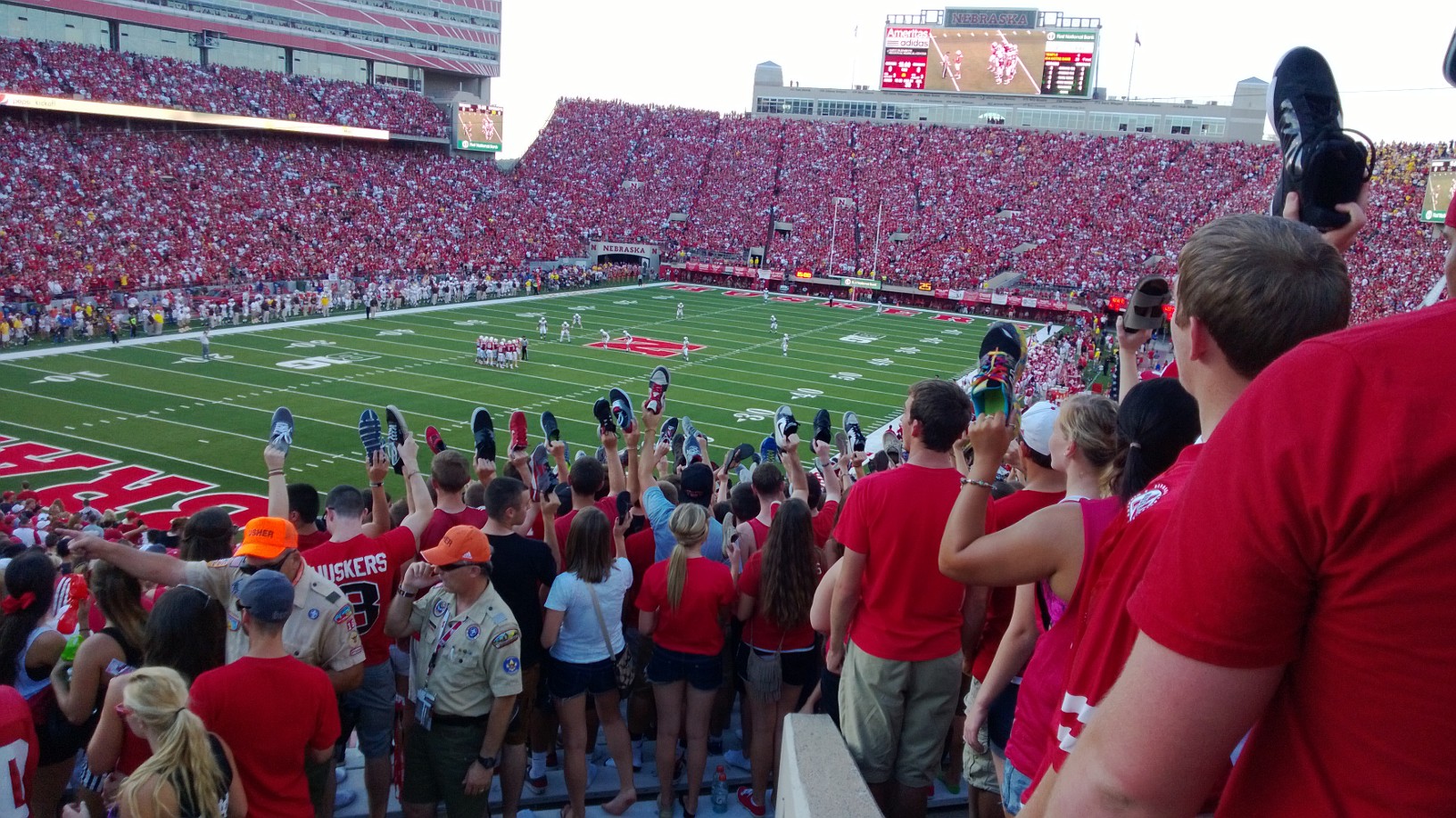 When it is the ’huskers’ opponents turn to attempt to score, the blackshirts are brought onto the field. Every time, their entrance is accompanied by menacing music. This is the cue for the student section to pound their wrists together, arms crossed, a ritual practice intended to strengthen the blackshirts and improve their ability to bring down their foes. In addition, the screens encourage all in attendance to “get loud,” to make noise, and to cheer for the ’huskers. This not only intimidates the warriors on the other side and encourages the blackshirts, it also provides very practical help to the ’huskers by making it too loud for the opposing team to strategize together on the battlefield.